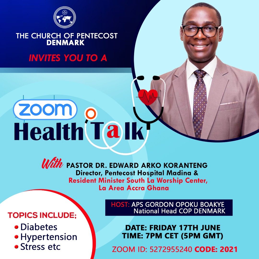 Health Talk Zoom Health Talk with Ps Dr Edward Arko Koranteng Start Date: June 17, 2022, 7 p.m. End Date: June 17, 2022, 9 p.m. Place of Event: Zoom