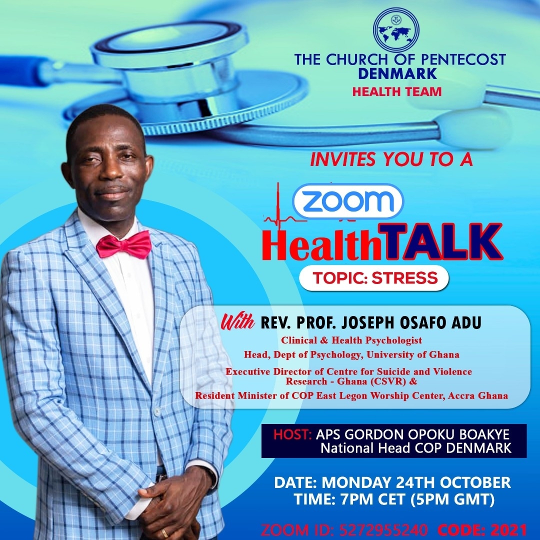 Zoom Health Talk - STRESS Zoom Health Talk on STRESS with Rev Prof. Joseph Osafo Adu Start Date: Oct. 24, 2022, 7 p.m. End Date: Oct. 24, 2022, 9 p.m. Place of Event: Zoom
